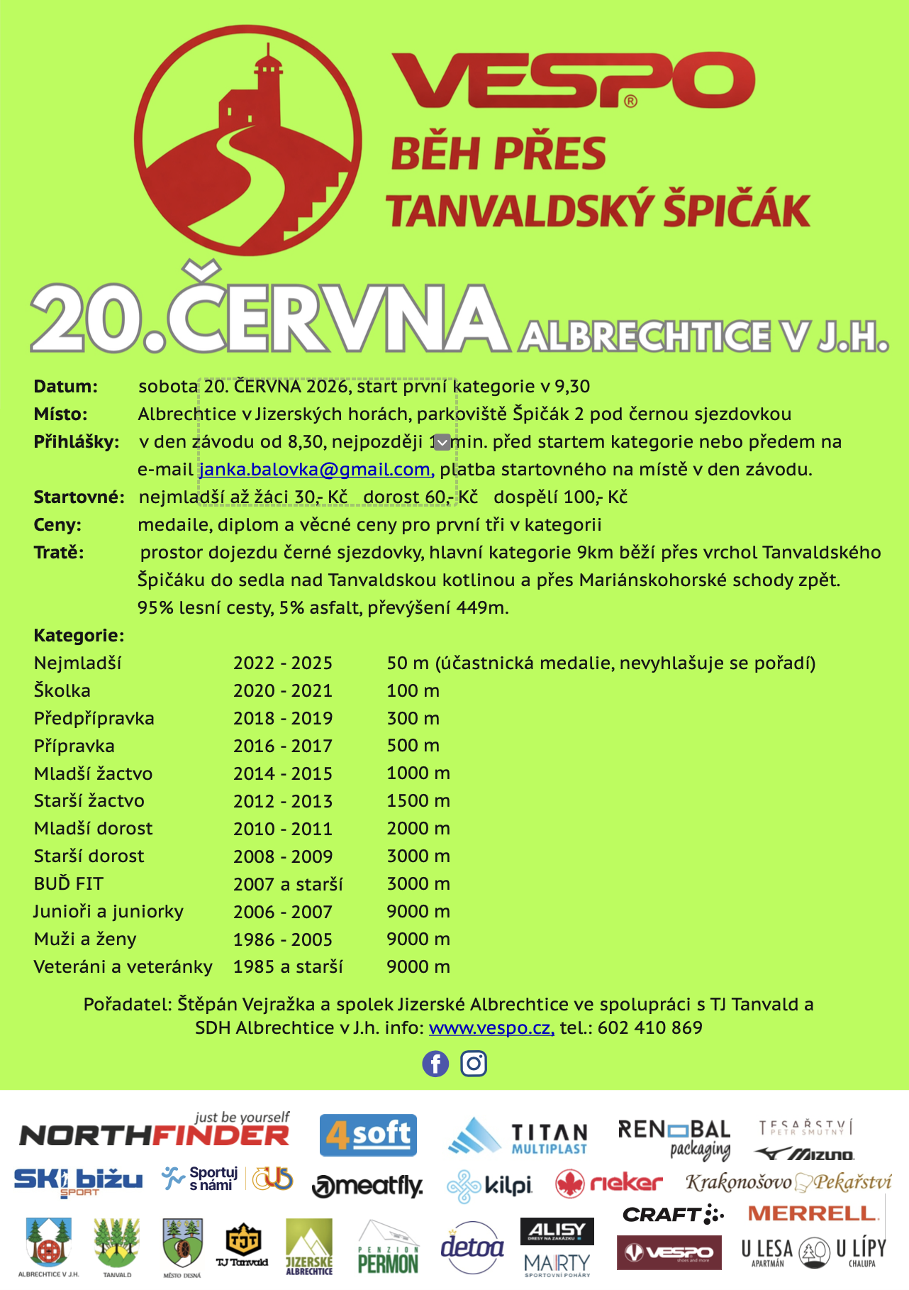 V těchto dnech roztáčíme přípravy dalšího již 12. ročníku VESPO běhu přes Tanvaldský Špičák, který se uskuteční v sobotu 20.6.2026. Propozice zde.